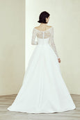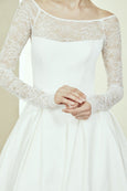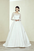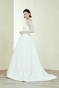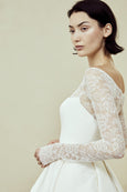 Silk Faille off-the-shoulder ballgown with long-sleeve stretch lace neckline.