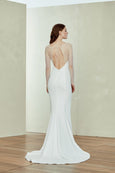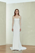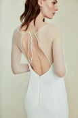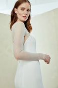 Crepe slim fit to flare gown with seam detailing and sheer illusion long sleeve and back.
