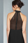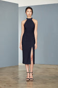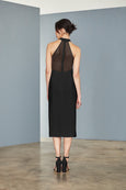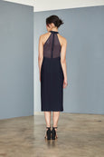 Crepe halter neckline sheath dress with sheer illusion back and slit. Available in Black and Navy.