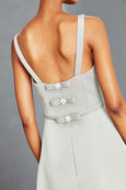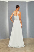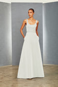 Faille scoop neck gown with soft A-line skirt and Crystal embroidered bows in the back.