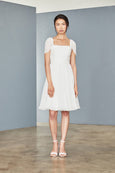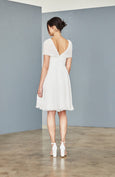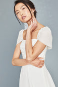 Silk crinkle chiffon dress with lightly draped bodice and cap sleeve. Shown in Ivory.