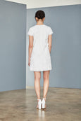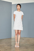 3D embroidered lace t-shirt shift mini dress. Shown in Silk White.