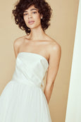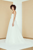 Satin draped strapless ballgown with soft tulle skirt and twisted back bow detail