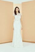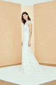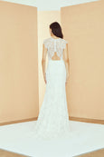 Primrose Chantilly lace fit-to-flare gown with short sleeves and sheer lace back.
